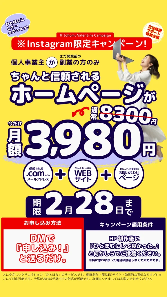 Instagramからの受付限定で、月額3,980円のサービスを2月のお申し込みだけに限り受付開始しました。副業・個人事業主様のみ対象でございます。是非、Instagramを確認してみてくださいませ。 Instagramへ -